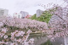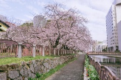 旧福岡県庁跡地にあり、広大な芝生広場や国指定重要文化財「貴賓館」などを有する天神中央公園は、花見の名所として知られています。薬院新川沿いのさくら広場に、ソメイヨシノやヤマザクラ、サトザクラなど約50本が植栽されており、例年3月下旬から4月上旬にかけて見頃を迎え、最盛期には川沿いに桜のトンネルが出現します。夜にはさくら並木などがライトアップされ、幻想的な夜桜が観賞できます。