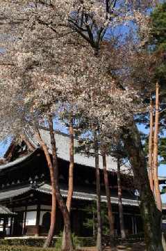 室町幕府3代将軍の足利義満により、夢窓疎石を開山として創建された相国寺は、桜の名所としても知られます。裏方丈庭園には、常照皇寺から苗木を寄贈された「九重桜」があり、例年4月上旬に紅色をした可憐な花を咲かせます。幹回り4.4m、枝ぶりは最大20mにも達する巨木で、「春の特別拝観」で見学できます。特別拝観では、重要文化財の法堂をはじめ、方丈、開山堂が公開されます。