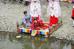 粉河に早春を招く「紀の川流し雛」が開催されます。粉河寺境内の特設祭壇に、子どもや市民がそれぞれの願いをこめた紙雛を奉納し、子どもの健やかな成長と市民の安全と幸せを願う祈願祭が行われます。その後、「お姫さま」を先頭とした大行列が寺を出発し、とんまか通りから紀の里農協粉河支所前の中津川川原までを華やかに練り歩きます。川原に到着した「紙雛」は、子どもたちや市民の手により、優しく中津川に流されます。