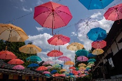 加賀伝統工芸村ゆのくにの森に、3月上旬から11月下旬にかけて、「アンブレラスカイ・ロード」が出現します。頭上に飾られたカラフルな傘と、趣ある古民家との取り合わせは、絶好の被写体となり、写真スポットとしても人気があります。
