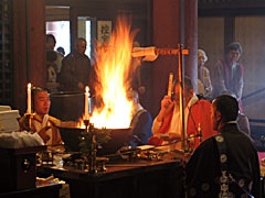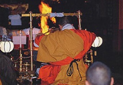 仮六時堂内に護摩壇が設けられ、炎の中に護摩木を投じて、ご祈祷が行われます。「星供(ほしく)」とも呼ばれ、生まれた年により定まる「本命星」や「諸宿曜」をお招きし、供養することによって、一年間の除災招福や諸願成就を祈ります。
