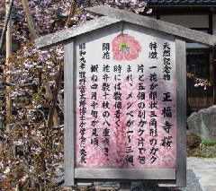 伝教大師最澄上人がおよそ1200年前に創立した、天台宗の流れをくむ天龍山正福寺には、町指定の天然記念物「名木正福寺桜(八重桜の変種/キンキマメザクラとヤマザクラの自然交配種)」が植えられています。がく片10枚で一花を包み、雌しべが数本ある珍しい八重桜です。例年3月下旬になると美しい花を咲かせ、見る人を魅了します。