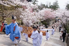 讃岐路に春の訪れを告げる桜一色の華やかな祭が、金刀比羅宮で開催されます。祭典では、桜の小枝で飾られた海川山野の神饌が奉られ、斎主が祝詞を奏上し、引き続き舞曲が奏進されます。琴平山(象頭山)の中腹に鎮座する金刀比羅宮は、参道の長い石段があることでも有名で、御本宮まで785段、奥社までの合計は1368段にもおよびます。