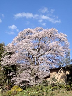 暗井沢の西の端に立つエドヒガンザクラの古木で、樹齢は推定500年といわれます。「新田の桜」と親しまれ、さまざまな風雪に耐えて、例年4月中旬になると鮮やかなピンク色に染まります。