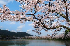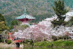 大沢池の周辺を中心に、ソメイヨシノやヤマザクラなど約500本が植えられ、例年3月下旬から4月上旬に見頃を迎えます。嵯峨天皇が、嵯峨院を造営した際に作庭した、現存する日本最古の庭池とされる大沢池の水面に桜が映り、より一層の美しさを湛えます。