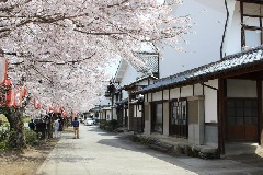 城下町小幡の武家屋敷地区のそばを流れる雄川には、堰沿いに約40本のソメイヨシノの桜並木があり、例年3月下旬から4月上旬にかけて美しい花を咲かせます。雄川堰は「日本名水100選」にも選ばれています。近隣には、旧小幡藩武家屋敷松浦氏屋敷(県指定史跡)や楽山園(国指定名勝)があり、桜を愛でながら、江戸時代の城下町の風情を楽しめます。「城下町小幡さくら祭り」では、華やかな戦国絵巻を再現する武者行列が行われます。