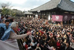 元興寺の「節分会」では、本堂に不動明王2体が遷座され、12時より法要が営まれます。その後、13時より本堂の正面で山伏姿の修験者たちによる柴灯護摩供、14時頃から火渡り修行、15時からは境内にて人数制限の上で、舞台上から福豆まきが行われます。※当日、火渡り修行をした人、特別祈願をした人は、豆まき会場へ入場可能