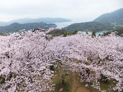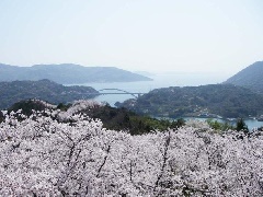 開山公園は、春には約1000本のソメイヨシノが咲く桜の名所で、山頂の展望台からは、伯方・大島大橋、大三島橋、多々羅大橋が一望できます。夜間にはライトアップも行われ、昼間とは一味違った夜桜を見物できます。
