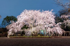 「春夜の六義園 夜間特別観賞」と題し、六義園の春恒例のライトアップイベントが開催されます。普段は入園することができない夜の庭園が特別開園され、しだれ桜を中心に、六義園の主景観の一つである中の島、吟花亭跡(ぎんかていあと)、水香江(すいこうのえ)など、各スポットがライトアップされます。六義園のシンボルともいえるしだれ桜は、高さ約15m、幅20mにも及び、夜空に浮かび上がる姿は見ごたえがあります。岩崎家時代に建てられた土蔵壁面へのプロジェクション映像の投影や、フォトスポットなどもあり、幻想的な夜の庭園を楽しむことができます。※夜間特別観賞の際は、駒込駅から徒歩2分の「染井門」から入園、正門から退園。詳細はホームページ参照