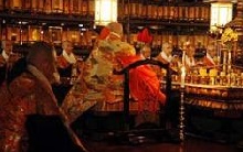 高野山奥之院では毎年3月21日に、燈籠堂にて法会「正御影供」が行われます。お大師様が時の天皇より下賜された「檜皮色の御衣」が燈籠堂に運ばれ、加持された後、伽藍御影堂内々陣に奉納されます。