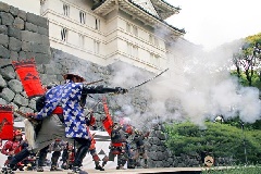 戦国時代、五代にわたって理想の国づくりを目指した戦国大名、小田原北条氏をたたえる、地域最大のお祭りが開催されます。銅門広場特設ステージでの出陣式のほか、歴代小田原城主をはじめ、武者隊や姫隊を中心とした武者行列と、市内の中学校や高校などの吹奏楽部やバンドチーム、神輿などのまち衆隊も参加し、総勢1600人が勇壮に練り歩きます。鉄砲衆による発砲の演技や、風魔忍者によるパフォーマンスも必見です。