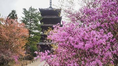 仁和寺では、例年3月下旬から4月上旬にかけて、「御室ツツジ(コバノミツバツツジ)」が見頃となるのを皮切りに「御室花まつり」が開催されます。続いて4月上旬から中旬に、樹高が約2~3mにしかならない珍しい桜林で、大正13年(1924年)に名勝に指定された約200本の「御室桜」が見頃を迎えます。同時期に、シダレザクラやソメイヨシノなども美しく咲き誇ります。4月下旬から初夏にかけては、目に眩しいもみじの新緑が参拝者を迎えます。
