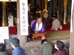 安倍文殊院の年に一度の大祭が、文殊さまの御縁日に行われます。この日にお詣りをすると、本堂前で参拝者全員が「お加持祈祷」を受けることができ、僧侶により文殊さまの智恵袋が頭に当てられ、智恵が授かるといわれています。