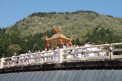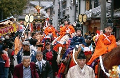 「多賀まつり」とも呼ばれ、鎌倉時代の古文書にもある多賀大社の大祭は、毎年4月22日に開催されます。飾りをつけた約40頭の馬をはじめ、神輿、鳳輦などで成る総勢500人の行列が見どころとなっています。主役は御使殿(おつかいでん)と呼ばれる祭使役と馬頭人(ばとうにん)の2人で、両者は1月3日から大祭まで精進潔斎し、さまざまな神事に奉仕する大役を担います。