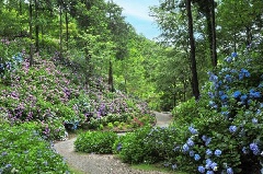 役行者の開山と伝わる救馬渓観音にある「あじさい曼荼羅園」には、ガクアジサイやビブレイをはじめ珍種のものまで、約120種類1万株ものアジサイが植栽されています。ピンク、紫、青、白といろとりどりのアジサイが、急な山の斜面に華やかに咲き誇り、まるでアジサイの谷の底にいるような気分が楽しめます。近年は約1万人が訪れるアジサイの名所で、土日にはさまざまなイベントも開催されます。