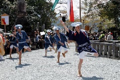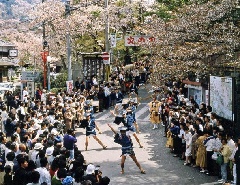 吉野山全山の桜の本尊、金剛蔵王権現に桜の満開を報告する「花供会式(花供懺法会)」が行われます。見頃の時期には、約3万本の桜が咲き乱れる吉野山を背景に、奴行列、稚児、山伏、僧侶などの大名行列が練り歩きます。「花供千本搗き」でつかれた餅が、境内でまかれます。