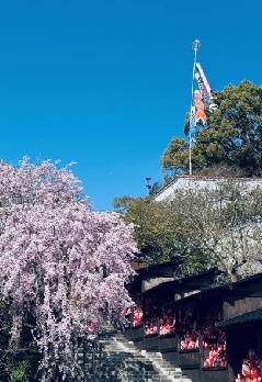 遅咲きの桜で有名な勝尾寺では、下界の桜が花を落とす頃に、境内の桜が見頃を迎えます。約8万坪の境内に一歩足を踏み入れると、深い緑をバックに薄紅色の見事なしだれ桜が咲き誇り、参拝者を出迎えます。数種類の桜と自然が織りなすコントラストは、まるで一幅の絵画を見ているかのような風景です。