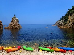 網代港からスタートし、浦富海岸の西側に位置する景色豊かな海を、シーカヤックで周遊します。インストラクターの丁寧な指導で、子どもから大人まで男女問わず、初心者でも楽しめます。海側から望む山陰海岸ジオパークの地層が重なり合った美しい景色は、一見の価値があります。このほか、船底まで透明なクリアカヤックの体験や、シュノーケル体験などのプログラムもあります。※濡れてもよい服装、帽子、マリンシューズ、手袋、日焼け止め、飲み物などを持参してください。渚交流館まで/JR岩美駅から「田後・陸上行」の町営バス「海と大地の自然館」~徒歩1分
