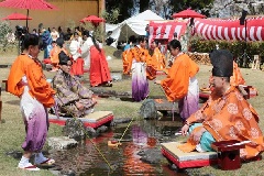 平安の雅を現代に再現する「ふちゅう曲水の宴」が行われます。小川の流れに、にごり酒の盃を載せた羽觴(うしょう=鳥の形をした木掘りの板)を浮かべ、琴の調べを聞きながら、十二単に身を包んだ平安歌人風の女性や、衣冠、狩衣の古式ゆかしい正装に整えた男性歌人が、羽觴の流れにあわせて短冊に歌を詠み、酒を飲みほします。最後に、歌人らの短冊を朗詠者が詠みあげます。