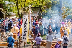 日向薬師の春季例大祭は、毎年4月15日に開催される年に一度の祭りで、「かながわのまつり50選」にも選ばれている伝統行事です。柴燈護摩供(神木のぼり、火渡り行事)が斎行されるほか、国の重要文化財である本尊鉈彫薬師三尊像が御開帳され、毎年多くの参詣客で賑わいます。