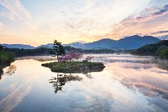 日野川ダムの周囲には桜が植栽されており、例年4月上旬になるとソメイヨシノが咲き始め、続いて八重桜が開花します。ダムの周りの遊歩道を春風に吹かれて散策しながら、花見を楽しむことができます。なかでも、ダムの浮島に咲く八重桜は美しく、風がないだ日は水面に八重桜がきれいに映ります。八重桜と日の出を撮影するため、早朝から多くのカメラマンが訪れる人気の撮影スポットとなっています。