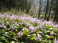 丹波市氷上町清住にある関西最大級のかたくりの花の密集群生地では、例年3月下旬から4月中旬にかけて、かたくりの花が開花します。かたくりの花は、丹波市の花として知られており、ピークとなる4月上旬には、クヌギ林の中で薄紫色の可憐な花が一面に咲き、まるで紫の絨毯を敷き詰めたかのような景観が楽しめます。見頃にあわせて4月5日には、「清住かたくりまつり」が行われます。