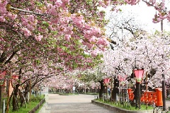 「さくら名所100選の地」に選定されている造幣局で、毎年4月上旬から中旬の1週間に「桜の通り抜け」が開催されます。造幣局南門(天満橋側)から北門(桜宮橋側)への一方通行で、約560mの桜並木が楽しめます。敷地内には、関山(かんざん)や普賢象(ふげんぞう)、松月(しょうげつ)など、約140種類、340本の桜が植えられています。