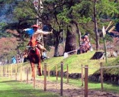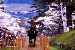 鷲原八幡宮の大祭は、例年4月の第1日曜に開催されます。古式ゆかしい小笠原流の「流鏑馬神事」が執り行われ、多くの見物人で賑わいます。全長250mの広大な流鏑馬の馬場は、鎌倉鶴岡八幡宮の馬場を模して造られており、日本で唯一原形を留める貴重な文化財として、島根県の史跡に指定されています。