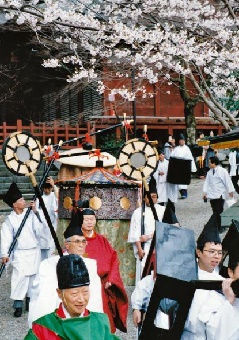 談山神社の境内の桜が見頃となる毎年4月第2日曜に、春の大祭が斎行されます。本殿での神事とともに、隔年で神輿渡御が行われます。多武峰の山中には、楼門(重要文化財)、本殿(重要文化財)、権殿(重要文化財)をはじめとする朱塗りの美しい社殿が立ち並びます。