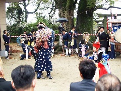 曽根崎町老松神社において、鉦(かね)と太鼓による調子にあわせて、獅子舞が披露されます。雄獅子、雌獅子、つり合い獅子の順序で演じられ、雄、雌獅子とも前獅子役と後獅子役があり、童子の獅子つりにつられるように舞う様子を見ることができます。老松神社の神幸祭として行われ、土地の悪霊を鎮めて人々を浄め、豊作が祈願されます。