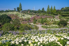 藤堂高虎ゆかりの風早池に隣接する花の名所、かざはやの里では、例年5月下旬から7月中旬にかけて、サブリナ、セルマ、スカイブルーなど、58種7万7700株のあじさいが池のほとりを彩ります。ピンクやブルー、パープルの花のグラデーションで美しくデザインされた花壇や大斜面、エントランス、あじさいロードなど、約2万8000平方mにわたり一面に咲くあじさいを観賞することができます。「あじさいまつり」では、クイズなどが催されるほか、手打ちソバやキッチンカー、茶店の出店もあり、終日楽しめます。