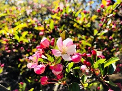 世界中で唯一、えびの高原の渓流沿いのみに自生するノカイドウ約300株が、例年4月下旬から5月上旬にかけて開花します。濃赤色のつぼみが開き、ピンクがかった白い花が枝いっぱいに可憐な花を咲かせます。ノカイドウの自生地は、国の天然記念物に指定されています。