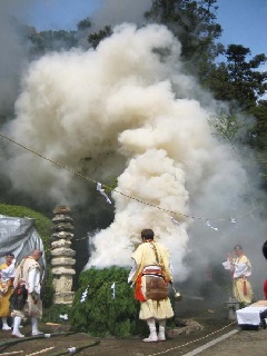 長岳寺の弘法大師大法会は「釜の口れんぞ」と親しまれ、14時より本堂前にて大柴灯護摩(だいさいとうごま 火の祭り)が厳修されます。犬鳴山妙泉講の修験者達により、行者問答、法弓作法、法斧作法などが本式に行われます。雄渾な噴煙と炎が境内の上空に立ち上る様は圧巻です。