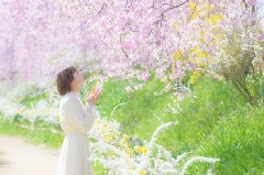 世羅高原農場の3万平方mの丘に、シダレザクラを中心とした桜が、例年3月下旬から4月上旬にかけて咲き誇ります。園内に入ると、空を覆うほどのシダレザクラがのれんのように来場者を迎えます。春の観光農園にふさわしく、菜の花やヒヤシンスなど、多様な春の花々と桜のコラボレーションを楽しめるのが魅力です。夜桜のライトアップも予定されています。