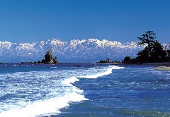 能登半島国定公園に位置する岩礁、白い砂浜、青松がつづく景勝地。富山湾越しに見る…