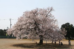 味真野小学校の校庭の真ん中にある一本桜。元気に遊びまわる子どもたちを温かく見守…