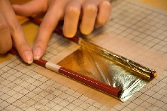 空気が動けば吹き飛ぶような極薄の金箔を工芸品に貼りつける金箔貼り体験が、金沢市…