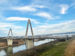 「サンセットブリッジ内灘」の愛称で親しまれる全長344mの斜張橋。河北潟放水路…