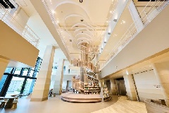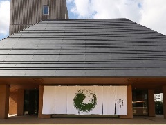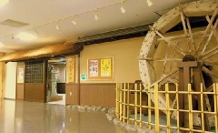 入口脇に水車、ロビーに縄文時代から現在までの歴史を描いたガラスアート年表を展示…