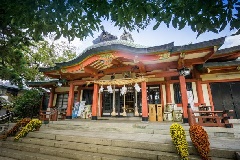 古い家並みが残り風情あふれる地域にある神社。名前の由来は、天皇の命を受けた武将…