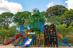 コンビネーション遊具を備えた芝生広場やスケートボードリンク、フットサルコートが…