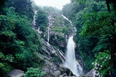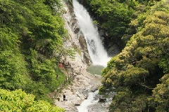 「日本の滝百選」でもある見帰りの滝は、岩盤の割れ目に沿って、水流が流れ落ちる姿…