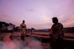 小浜温泉の海沿いにある長さ105mの日本一長い足湯。源泉は100度を超え、湯棚…