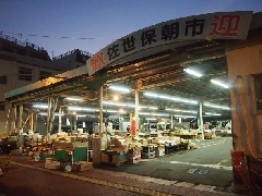 早朝3時頃から、新鮮な海の幸山の幸が並ぶ佐世保の朝市。広い市場内では、鮮魚をは…