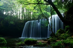 落差10m、幅20mと横に広く水が流れ落ちる様子が、まるでカーテンのような滝。…