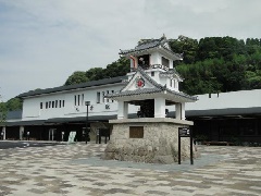 人吉城をイメージしたからくり時計。人吉城のお殿様が城下見物を行うという物語が、…