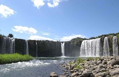 緒方平野の真中に位置する、幅120m、高さ20mの滝。上空から見ると美しい弧を…