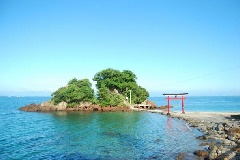 波打ち際の砂州の上に建つ赤い鳥居が印象的な荒平天神。本殿は天神島と呼ばれる緑に…