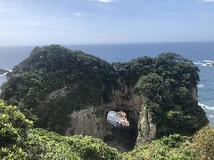 足摺岬先端の西方にある、花崗岩の岩盤が波の浸食により削られてできた海蝕洞。穴の…