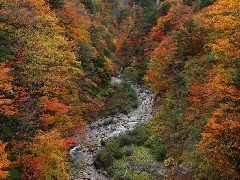 県内有数の紅葉の景勝地として知られている高瀬渓谷。槍ヶ岳を源流とする水俣川が合流する高瀬川は、上流から高瀬ダム、七倉ダム、大町ダムと3つのダムが続き、上流の2つのダムは、自然の石積みのロックフィルダムとなっている。七倉ダムの下流には、葛温泉の宿が3軒点在し、ここでは林や道路に野猿の遊ぶ姿が見られる。大町ダム脇にある高瀬渓谷緑地公園には、安曇野伝説の竜に乗った泉小太郎の像が建ち、ダムの高台は展望台にもなっている。